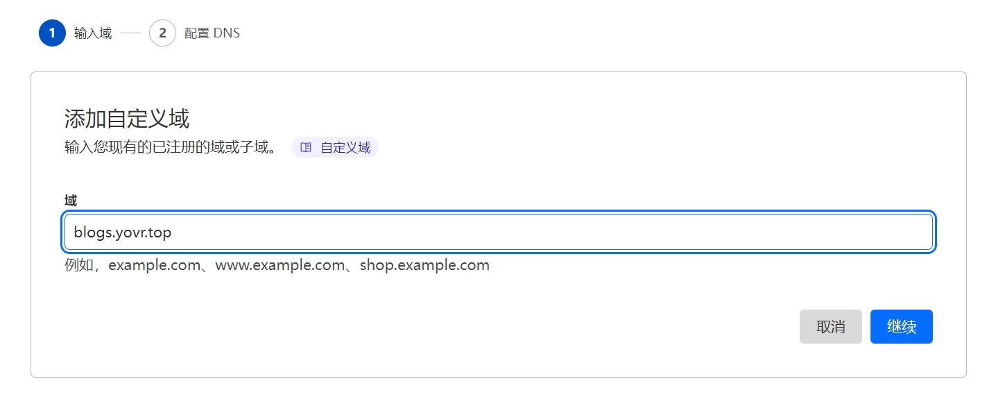 输入之前注册好的域名,或则子域名,我这里输入的是子域名。 yovr.top是我注册的域名。
